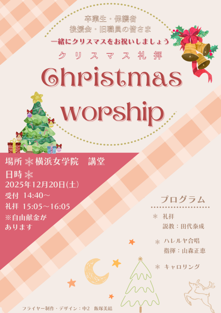 昨年に引き続き、今年も卒業生、後援会、保護者の皆さま、旧教職員の方々、横浜女学院に連なる多くの皆さまとともにクリスマスをお祝いしたく、クリスマス礼拝をまもります。下の案内の通り、12月20日(土)15:05より礼拝を開始いたします。人数の確認のため、以下の【参加申し込みフォーム】にご入力のうえ、皆さまお揃いでお集まりください。お待ちしております。