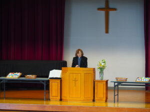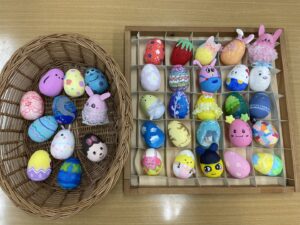 壇上には、中2の生徒たちが美術の授業で作成したイースターエッグも飾られました。どの作品も、イースターの喜びを表現した素敵なイースターエッグとなりました。