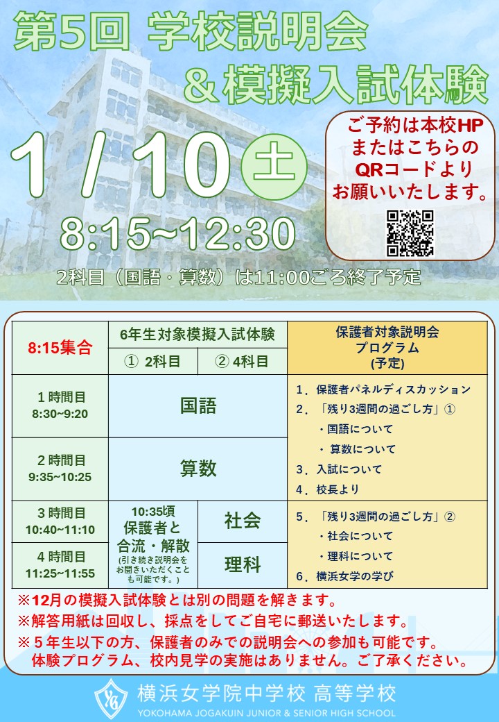 本日12月10日より、2026年1月10日(土)に行われる第5回学校説明会の予約がスタートします。