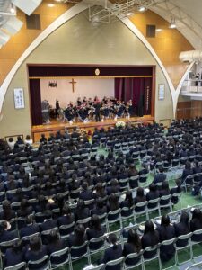 礼拝の後にはクリスマス祝会が行われ、今年は吹奏楽部が、クリスマスを祝う喜びに満ちた演奏を披露しました。