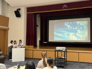 午後はK3、Open Japan、復興推進課の方々の講演会を聞かせていただき、その後ノトノミライという横浜女学院の生徒、明治学院大学の生徒、能登高校の生徒と意見交換をしました。講演では能登に関わるみなさんの、自ら行動する行動力がとても大きいと感じ、高校生だからできないなどは理由にならないと思いました。ここで学びを終わりにするのではなくて、この経験を活かしてもっともっと学びを深めていきたいなと思います。またこの震災を良い方向に生かすこと、これをチャンスだと思う事と言う良い方面もあるととらえる大切さを学びました。