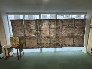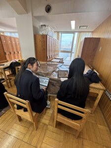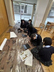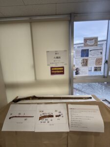 高2の選択授業である「日本史探究」において、国立歴史民俗博物館より火縄銃のレプリカおよび「洛中洛外図屏風 歴博甲本」床置きパネル(実物の約1.2倍大)をお借りし、特別授業を実施いたしました。授業では、洛中洛外図屏風をグループごとに二扇ずつ担当し、博物館ホームページの人物データベースを活用しながら、屏風に描かれた寺社・建造物・人々の姿を丁寧に読み解きました。誰が、どこで、何をしているのか、史料を根拠にそれぞれの視点から解説文を作成しました。単に「見る」のではなく、「史料として読み解く」学びを通して、戦国時代の京都の社会や人々の営みを立体的に理解する機会となりました。また、火縄銃のレプリカに実際に触れ、その重さや構造を体感しました。史料をもとに発射の仕組みや戦国期における運用方法を確認しながら、戦い方の変化や鉄砲の普及が社会に与えた影響について考察を深めました。実物大の資料に触れることで、生徒たちは教科書だけでは得られない実感をもって学ぶことができました。授業後は、火縄銃と洛中洛外図屏風を職員室前の廊下に展示し、本校内に小さな博物館のような知的空間が生まれました。多くの生徒が足を止め、作品を熱心に見つめる姿が見られ、学年を越えて歴史への関心が広がる機会となりました。
