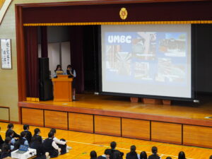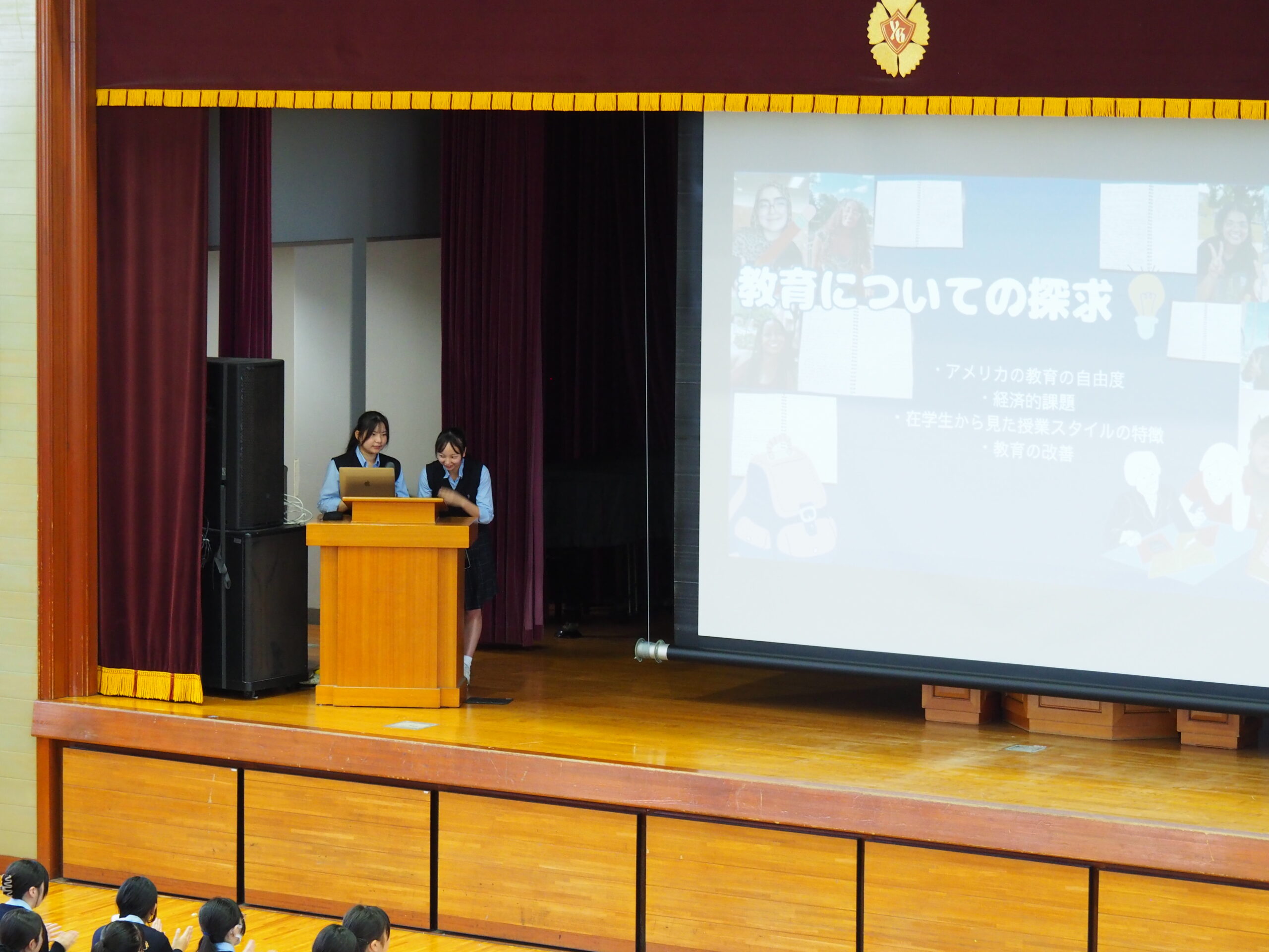 10月4日(土)、10月のAssemblyが行われました。Assemblyは「チャレンジ」をテーマにした全校集会です。校内外の活動に参加した生徒達がその活動を通じて学んだことを全校生徒に共有をし、次のチャレンジをうながします。今月のAssemblyは、UMBC(メリーランド州ボルティモア大学)への留学プログラムに参加した高校2年生の生徒による活動報告と、今年3月に本校を卒業した卒業生による、生徒会主催の制服リサイクル活動の報告と、大学受験を経て学んだことについての発表がおこなわれました。