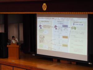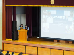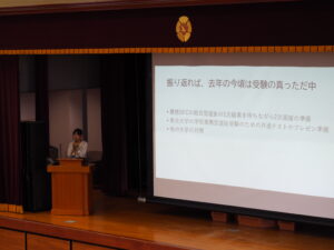 続いて、卒業生による生徒会の制服リサイクルの活動報告では、本校の生徒から寄付された制服のリユースやリサイクルを通じ、持続可能な社会の実現やSDGsについて学び、意識を高めることができました。また、大学受験の振り返りを聞き、在校生にとっては自身の進路について改めて考えを深める機会となりました。