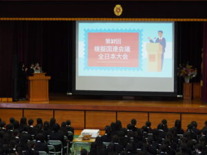 模擬国連ゼミに所属する3名の高校3年生より、昨年末に参加した「模擬国連会議 全日本大会」での活動報告と模擬国連の魅力や意義を伝え、後輩たちへの参加を促しました。模擬国連ゼミでは国内外の模擬国連への参加に向けて、勉強会を行っています。